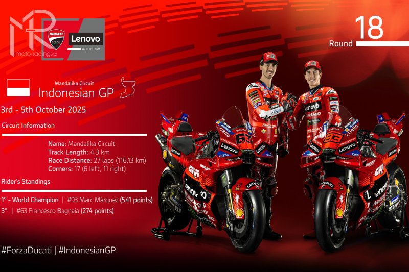 Po zisku titulu v Motegi je již čas čelit 18. kolu sezóny MotoGP 2025 v Indonésii. Ducati a Marc Márquez jsou již mistři světa v kategorii výrobců a jezdců; nyní jim zbývá jen zpečetit Triple Crown v královské třídě, což je cíl, kterého Ducati již dosáhla v letech 2007 a 2022. Poté, co v Motegi titul unikl o pouhé dva body, bude tým Ducati Lenovo potřebovat udržet náskok alespoň 309 bodů před Gresini Racing v cíli sobotního sprintu. Závod začne v 15:00 místního času na okruhu Mandalika, který se v kalendáři objevil poprvé v roce 2022 a na kterém motocykl Desmosedici GP dvakrát triumfoval (Bagnaia v roce 2023 a Martin v roce 2024).